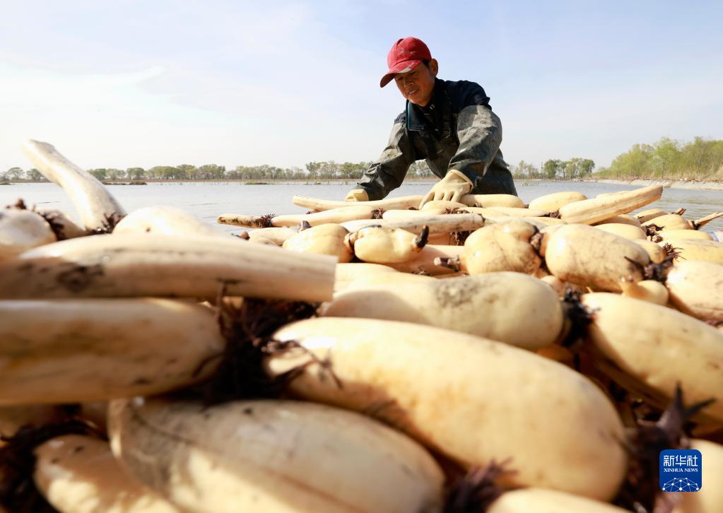 4月19日,唐山市丰南区东田庄乡大吴庄村农民在水塘里采收莲藕。