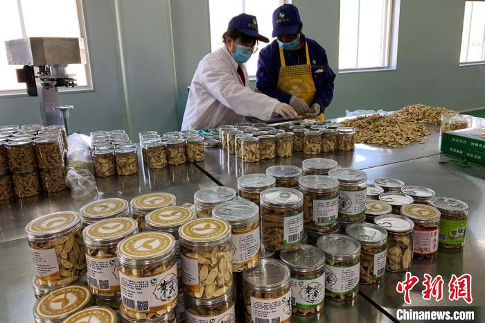 隆德县中药材加工车间内,工人进行中药材成品罐装。 中新网记者 李佩珊 摄