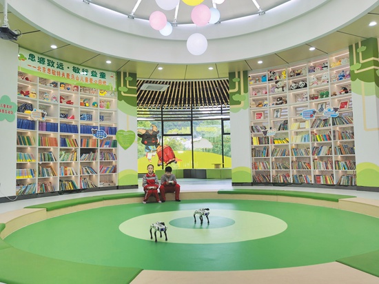 在该中心“萤火虫书巢”里,陈列着来自深圳小朋友捐赠的爱心绘本,翻动书页,仿佛能听见两个地域童心的共鸣。“智造工坊”内,亲子互动其乐融融。最吸引眼球的是AI机器人和机器狗互动区,科技之光在这里点亮了孩子们好奇的眼眸。