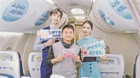 1月30日,航班乘务员向游客赠送特色小礼品。当天,由自治区文化和旅游厅与厦门航空联合打造的“山海情深·闽宁有礼”专项文旅促消费活动主题航班,降落在银川河东国际机场,机上满载来自福建的游客,标志着此次跨区域文旅促消费活动进入实质阶段,也为闽宁协作30周年献上了一份充满新意的文旅贺礼。 记者 王刚 摄 上一篇 下一篇