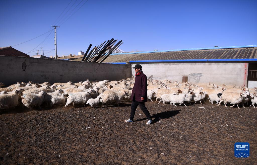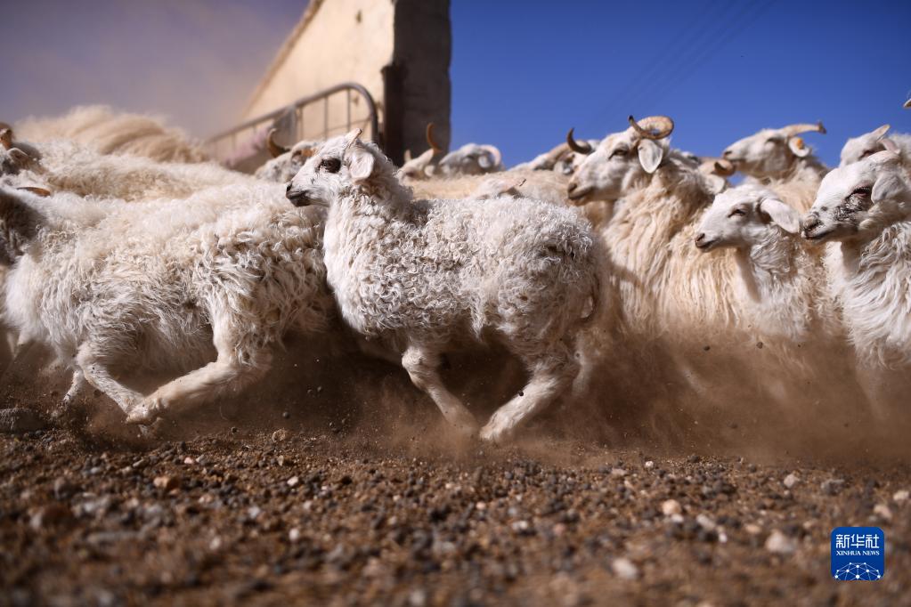 4月14日,在青海省海北藏族自治州刚察县泉吉乡宁夏村,牧民拉宝家的羊群离开羊圈前往草场。