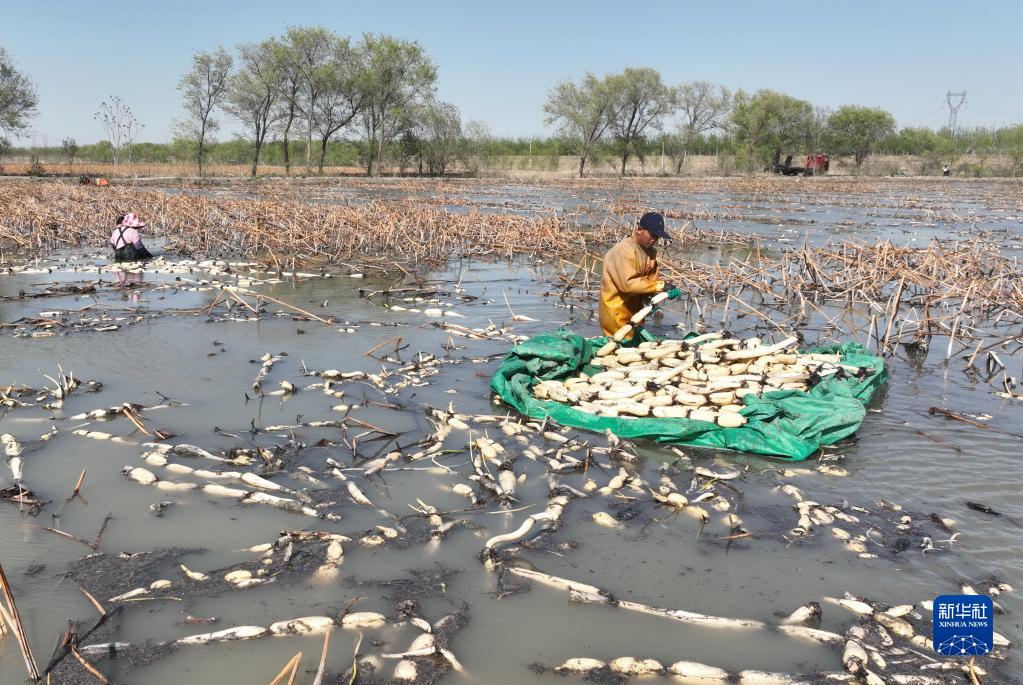 4月19日,唐山市丰南区东田庄乡大吴庄村农民在水塘里采收莲藕。