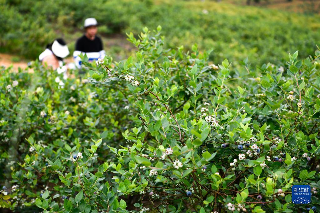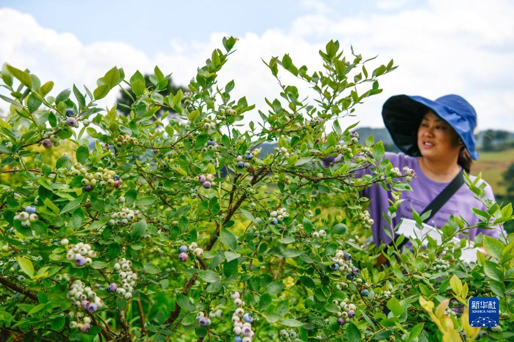 5月16日,在贵州省麻江县宣威镇翁保村,该县蓝莓产业发展服务中心的工作人员在采摘蓝莓。
