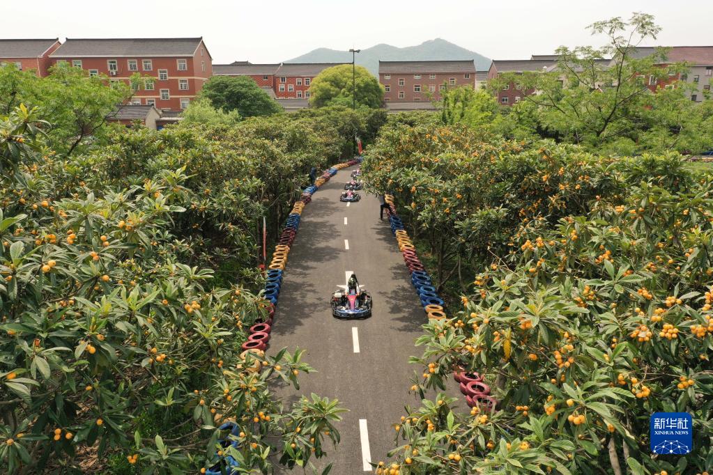 5月17日,游客在塘栖镇的枇杷园中体验卡丁车比赛(无人机照片)。