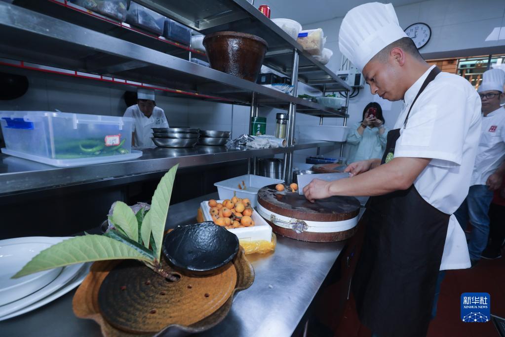 5月17日,塘栖镇塘栖村的一家餐厅的厨师在制作枇杷特色菜。