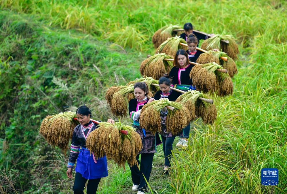 10月11日,村民在贵州省从江县高增乡建华村挑运香禾糯稻谷。