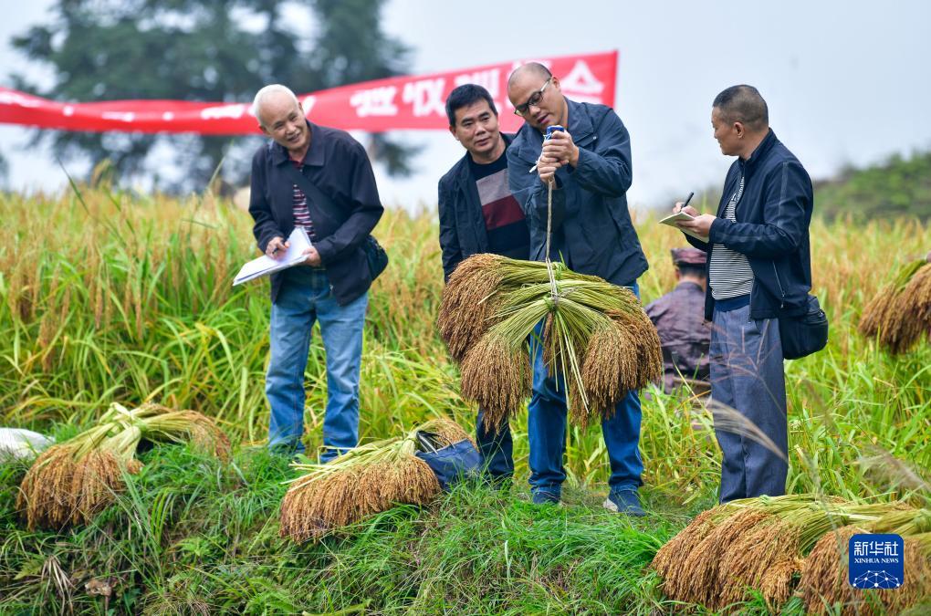 10月11日,农技人员在贵州省从江县高增乡建华村现场测产香禾糯稻谷。