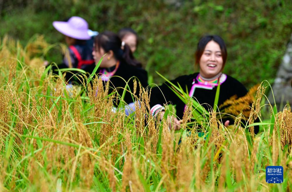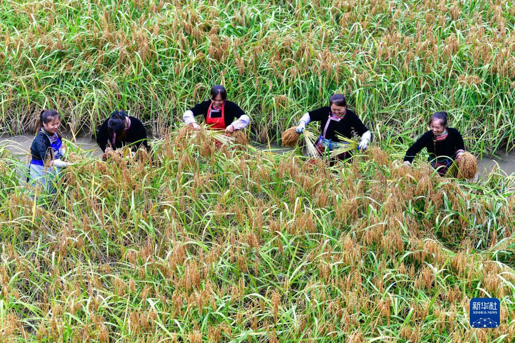 10月11日,村民在贵州省从江县高增乡建华村采收香禾糯稻谷。