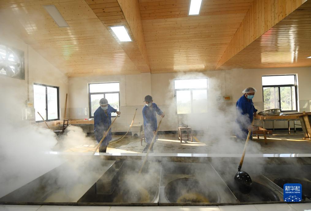 10月17日,丰江周村村民在共富工坊内熬制红糖。