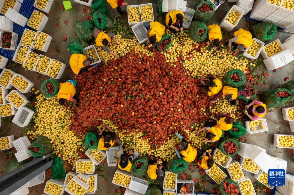 10月31日,在位于四川资阳市安岳县的四川省维记农业集团有限公司,工人初步挑选新鲜柠檬(无人机照片)。