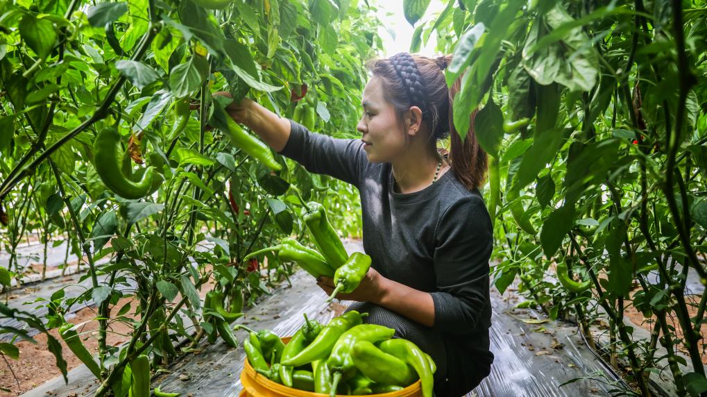 图为赤峰市宁城县种植户在大棚内采摘尖椒。(新华社发 王中文 摄)