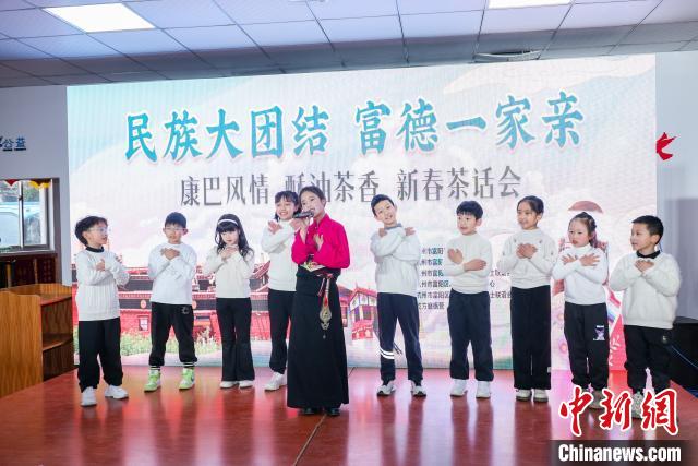 藏族姑娘拉尕(中)在杭州富阳和汉族小朋友们一起表演节目。受访者 供图