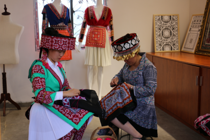 文旅融合,乡村变景区。在上海市和宝山区帮扶下,深挖本地苗族文化特色,建成国家AAA级旅游景区棠梨凹苗寨,依托沪滇协作建设“棠梨山海印”农文旅示范村,补全了棠梨凹“品特色菜肴、赏十万峰林、游棠梨村寨、住苗家民宿”的旅游链条,进一步丰富了乡村旅游新业态。此外,挖掘苗族传统歌舞、民俗和农耕文化,组建大水井乡苗族歌舞表演队,整理编排苗家迎宾礼、“苗家敬酒歌”“芦笙大团圆”、婚俗表演、苗族篝火晚会等歌舞节目,歌舞表演队由13人组成,均为擅长苗族歌舞的本地村民。据了解,表演队每场演出费约800余元,年收入2.6万余元。同时,竭力推进非遗传承,重塑苗族婚俗、传承苗族刺绣,苗族婚俗成功申报为县级非物质文化遗产代表性项目,金歹村村民李梅被命名为市级苗绣传承人,在她的带领下,5名当地村民成为苗绣绣娘。刺绣产品也受到了上海等地游客的欢迎。据统计,近三年来,5名绣娘通过各种途径接单500余件,累计收入10万余元,既传承和保护了非遗,又促进了群众增收。