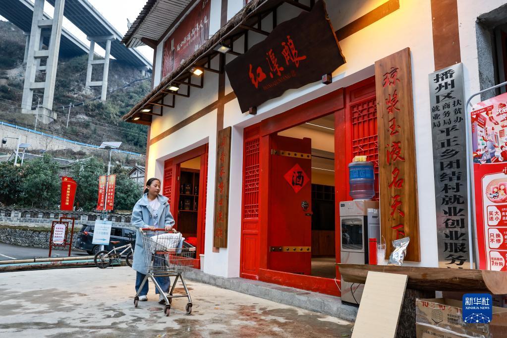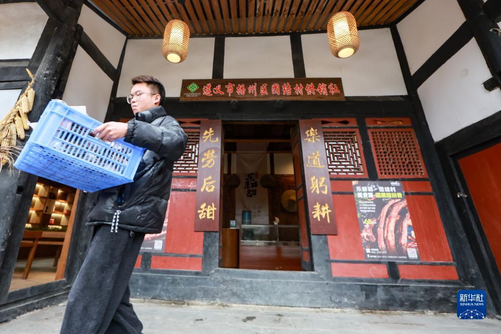 村民在团结村供销社前搬运货物(2月2日摄)。仁遵高速通车后,大量游客来到团结村观光旅游。