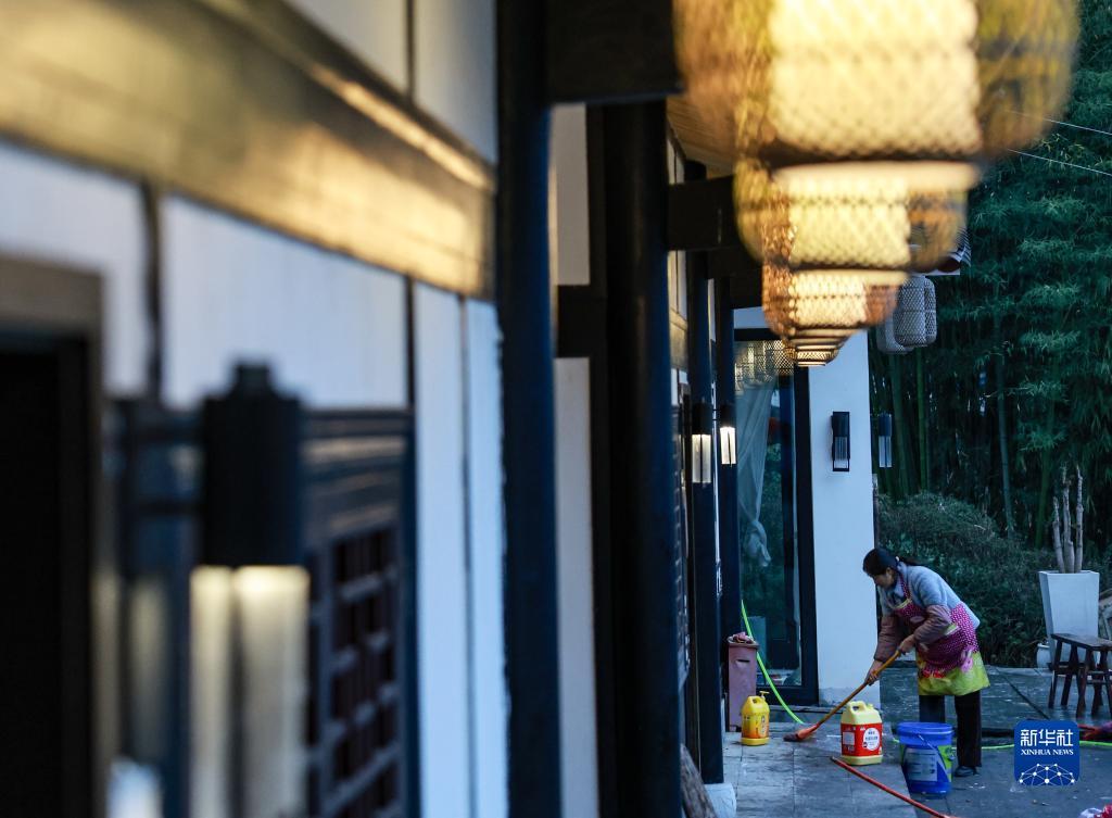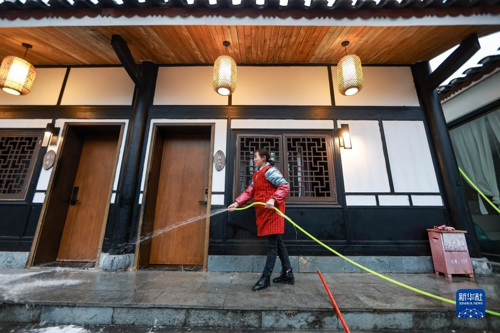 团结村村民在打扫民宿的卫生(2月2日摄)。仁遵高速通车后,大量游客来到团结村观光旅游。
