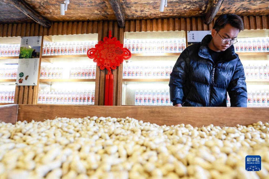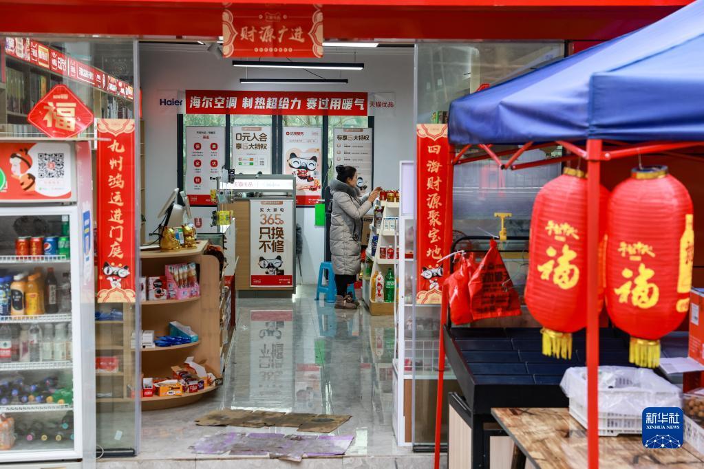 村民在团结村供销社内摆放货物(2月2日摄)。