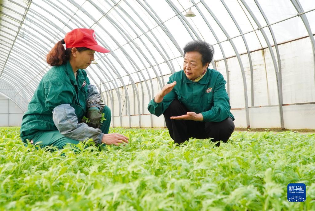 2月20日,在山东省曹县五里墩村,王银香(右)在生态农场里与村民交流。新华社记者 徐速绘 摄