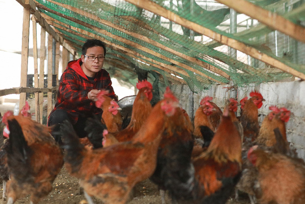万照辉正在给小香鸡投喂玉米。张碧桃摄