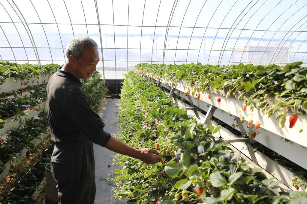 村民在大棚里查看草莓长势。(新华社记者齐雷杰 摄)