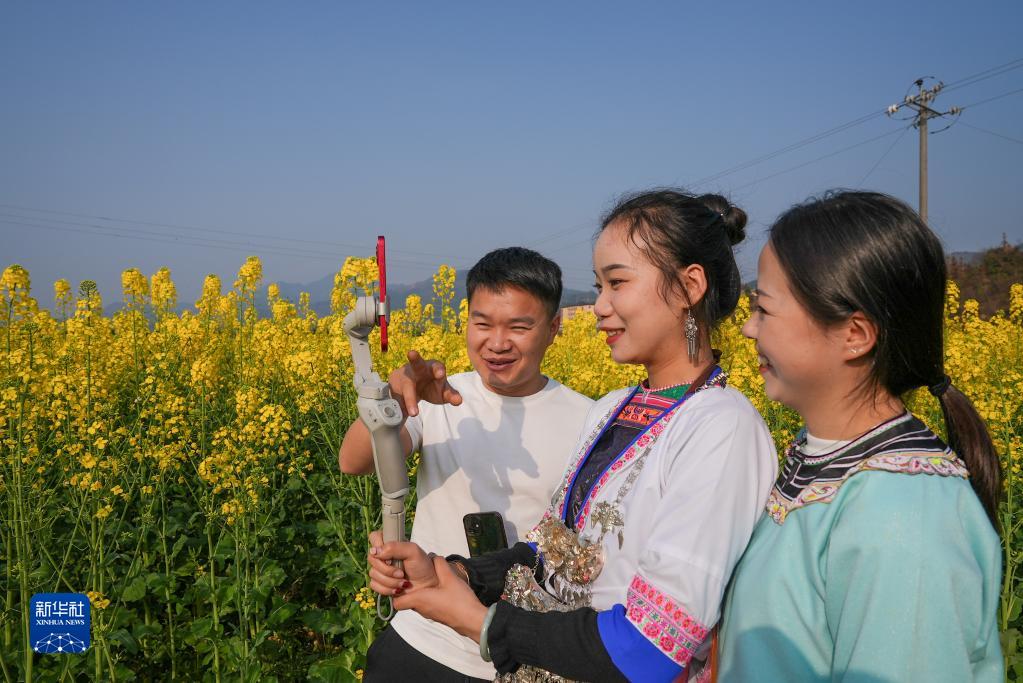 3月4日,唐胜忠(左一)在贵州省榕江县车江坝区油菜花园指导新主播直播。新华社发(王炳真 摄)