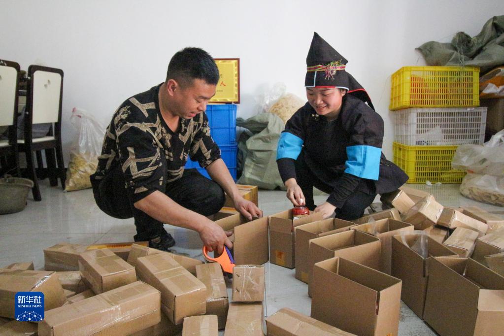 3月4日,在贵州省榕江县两汪乡两汪村,王启红(右)在家里打包产品。新华社发(陶明霞 摄)