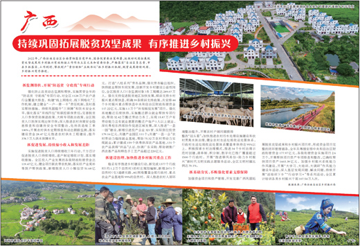 2022年,广西壮族自治区全面贯彻落实党中央、国务院重要决策部署,把做好巩固拓展脱贫攻坚成果同乡村振兴有效衔接工作作为立区之本和首要任务,严格落实“自治区负总责、市县乡抓落实、工作到村、帮扶到户”责任制和“五级书记”抓乡村振兴机制,脱贫成果持续巩固、乡村振兴有序推进。