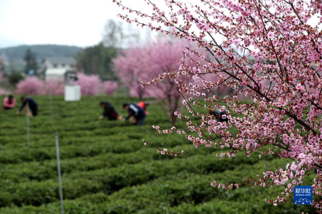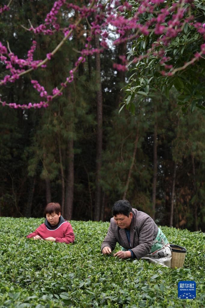 3月23日,村民在凤冈县永安镇田坝社区生态茶园基地采摘春茶。新华社发(袁福洪 摄)