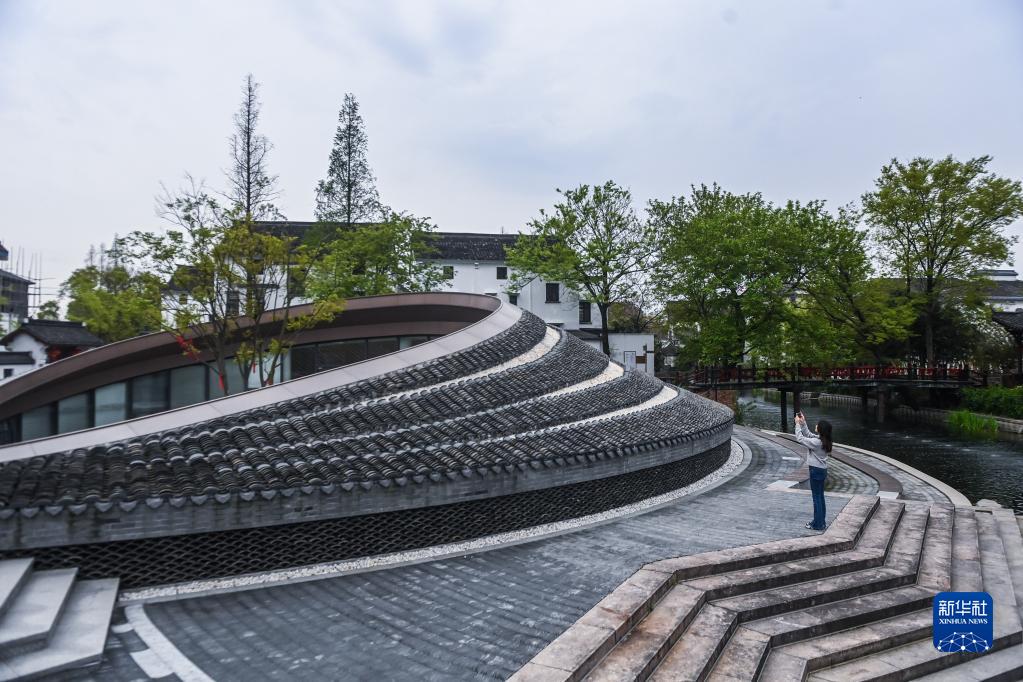 4月3日,游客在嘉兴市秀洲区王店镇镇中村的未来乡村展示馆外拍照留影。